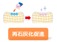食事や間食をするたびに、歯の表面では脱灰と再石灰化がくり返されています。脱灰によって溶け出したカルシウムやリンを再び取り戻す働きを助けるのがフッ素です。フッ素イオンが歯面に存在することで、ミネラルが効率よく沈着し、初期う蝕の修復につながります。