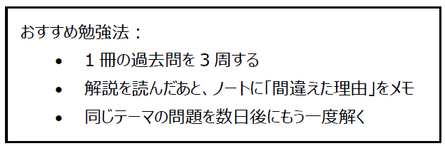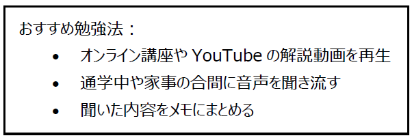 このタイプの方には、「読む→声に出して確認→問題を解いてみる」サイクルでの勉強がおすすめです。
