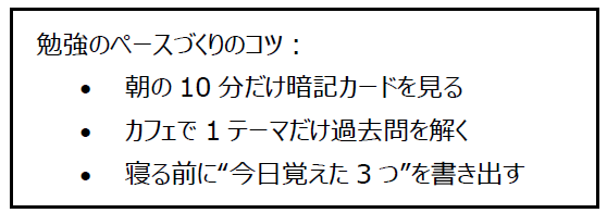 1日10時間詰め込むより、1日30分でも「続ける」ことが合格につながります。