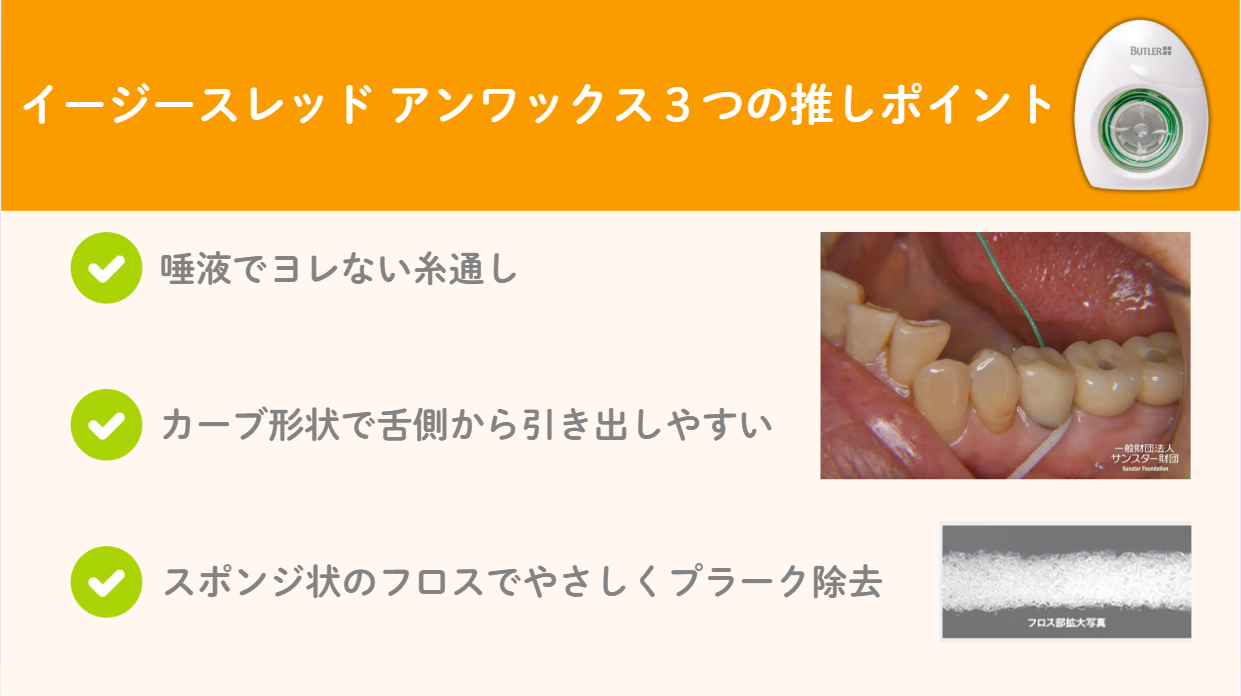 補綴装置周囲のケアに対応できるよう、フロス・歯間ブラシ・タフトブラシなど各種アイテムを揃えています。中でも特に私が重宝しているのが、バトラーの「イージースレッド アンワックス」です。