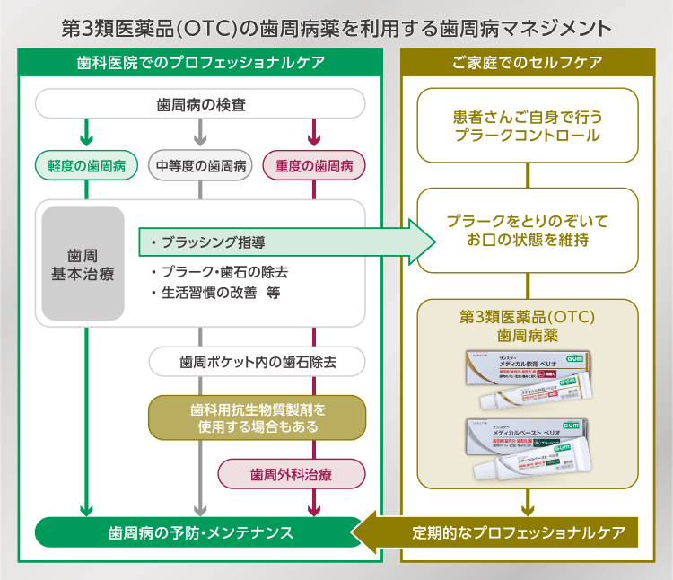 歯周病※の治療・予後管理には、歯科医院での定期的なプロフェッショナルケアに加え、ご家庭でのセルフケアの徹底が重要です。サンスターメディカル軟膏 ペリオは、そうした患者さんご自身で行うセルフケアの補助のための歯周病(歯肉炎・歯周炎)薬です。