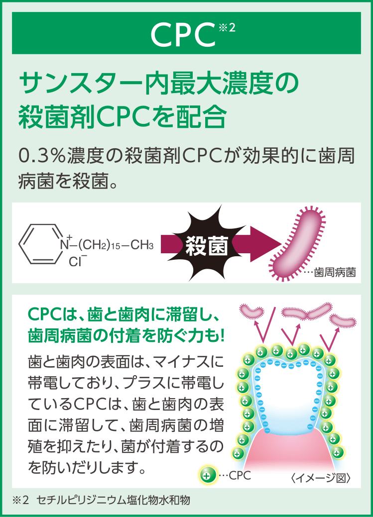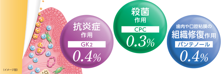 セチルピリジニウム塩化物水和物 | 3mg | 歯周病の原因となる細菌の増殖を抑える(殺菌作用) |