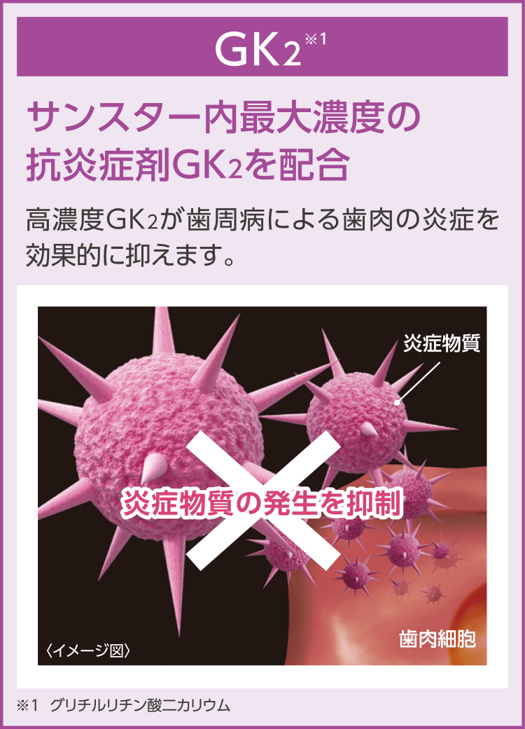 グリチルリチン酸二カリウム | 4mg | 歯肉や口内の炎症をしずめる(抗炎症作用) |