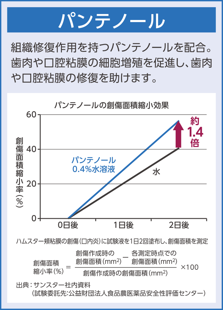 パンテノール | 4mg | 歯肉や口腔粘膜の新陳代謝を促進し、正常な組織へ回復させる(組織修復作用) |