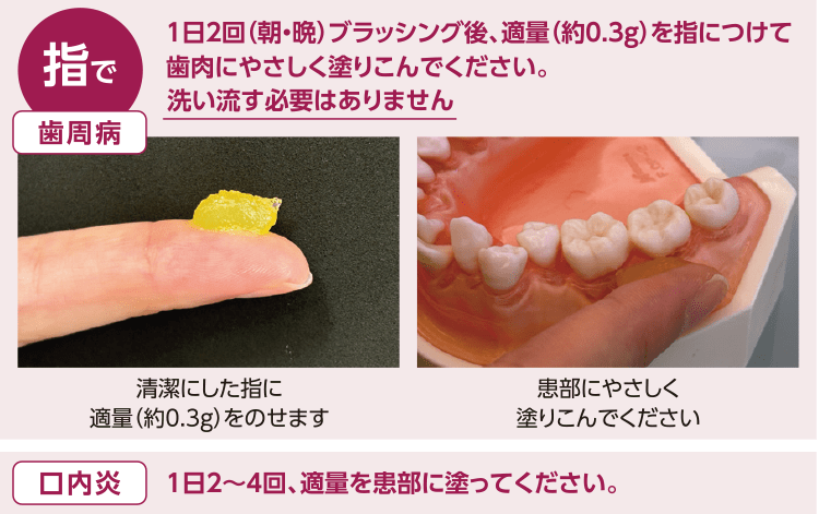 ⻭周病(⻭⾁炎・⻭周炎):1⽇2回(朝・晩)ブラッシング後、適量(約0.3g)を指につけて歯肉に塗りこむ。