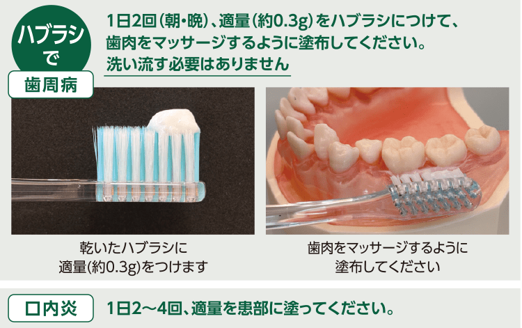 ⻭周病(⻭⾁炎・⻭周炎):1⽇2回(朝・晩)、適量(約0.3g)を歯ブラシにつけて歯肉をマッサージするように磨く。